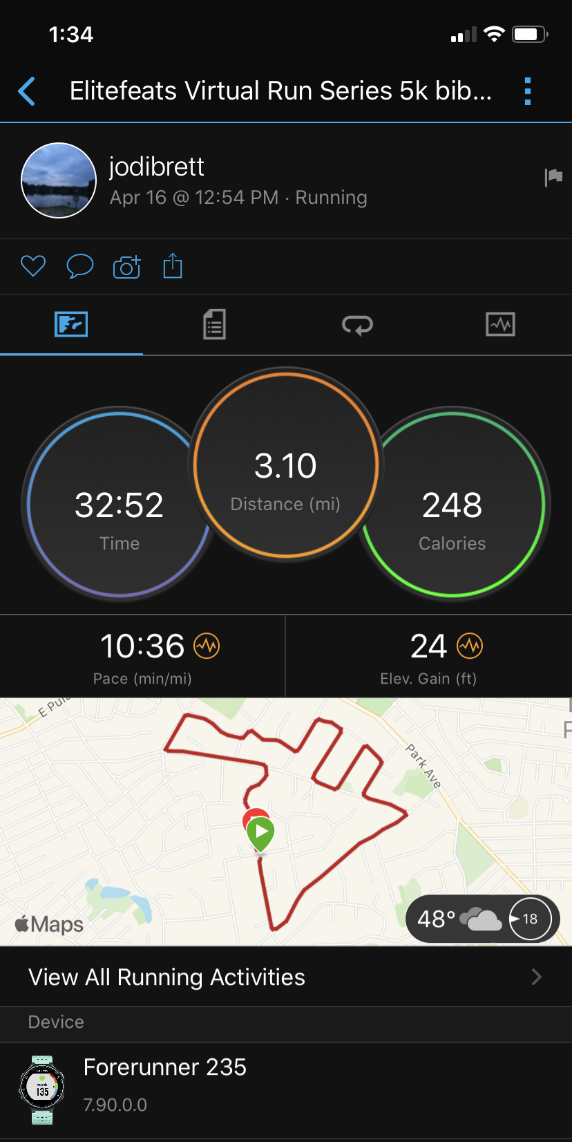 Bib# 95   Jodi Clarin - 00:32:52 - Virtual 5K Anywhere